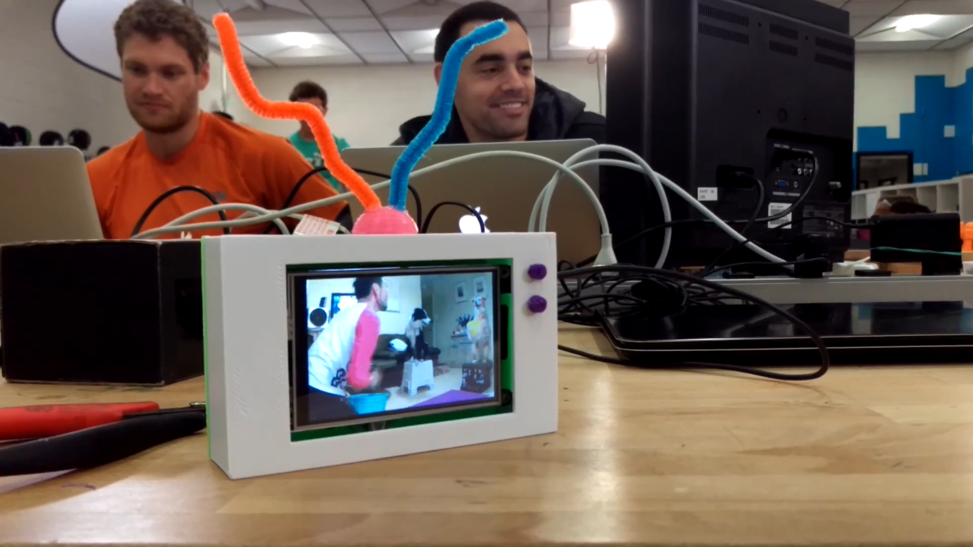 At a local hackathon hosted by the Digital Harbor Foundation, I built a mini "television" that could play animated gifs for endless entertainment. I used a Raspberry Pi, a wifi module, and a 3.5" LCD touchscreen to control the device. I also designed a custom case, and printed it using a rapid prototyping 3D printer. This was my first time printing something that I designed and modeled myself. I modeled my device after a vintage-style TV with "rabbit ear" antenna and volume/channel knobs, but more colorful.